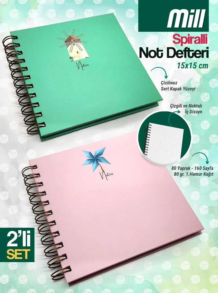 | Etiketler | 15x15 Cm Kare 2'li Set Spiralli Çizgili-Noktalı Tarihsiz Ajanda Not Defteri Mill |