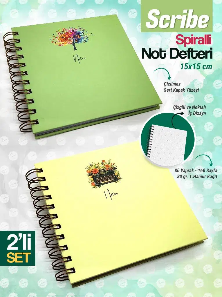 | Etiketler | 15x15 Cm Kare 2'li Set Spiralli Çizgili-Noktalı Tarihsiz Ajanda Not Defteri Scribe |