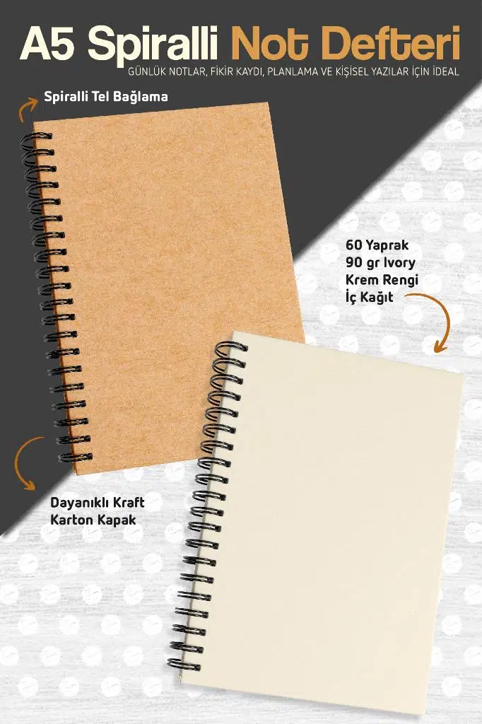 A5 Spiralli Not Defteri – 60 Yaprak | 90 gr Ivory Kağıt | Dayanıklı Karton Kapak