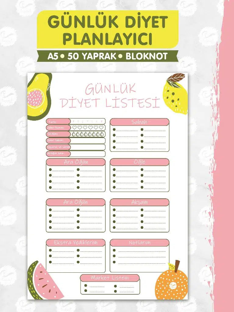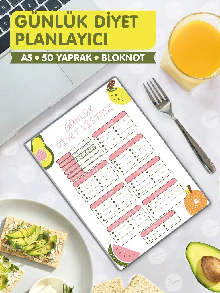 Sayfa Sayısı: 50 Yaprak Günlük Diyet Listesi planlayıcı Planner Ebat: A5 (a4 kağıdın yarısı) Tarz: Çek-Kopart Renk: Tamamı Renkli.