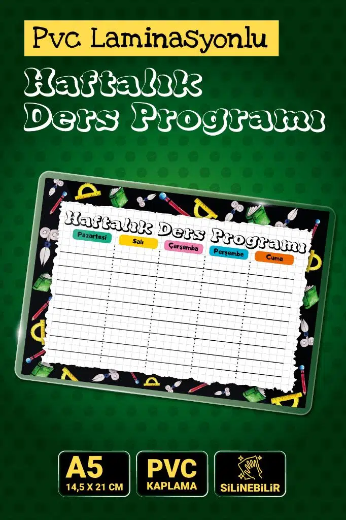| Etiketler | Haftalık Ders Programı Pvc Laminasyonlu Silinebilir - A5- 14.5x21 cm Ortaokul Çocuk Odası Kreş Anaokulu Duvar |