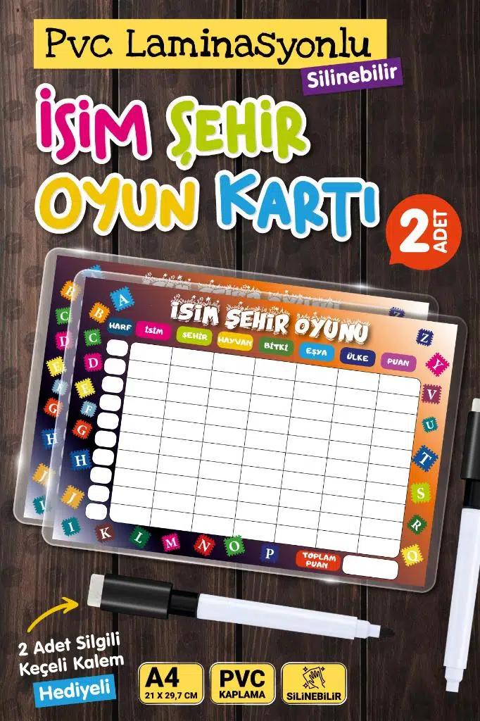 | Etiketler | İsim Şehir Oyunu Hayvan Bitki Eşya 2 ' li Set Yaz Sil Pvc Kaplı-Kalem Hediyeli |