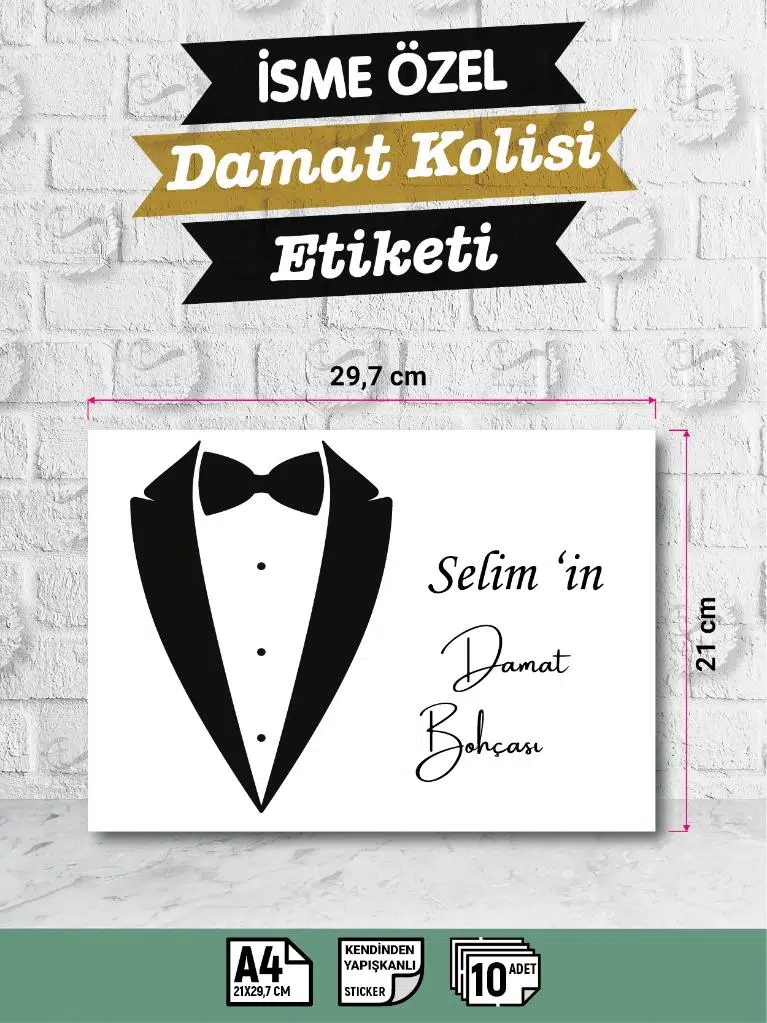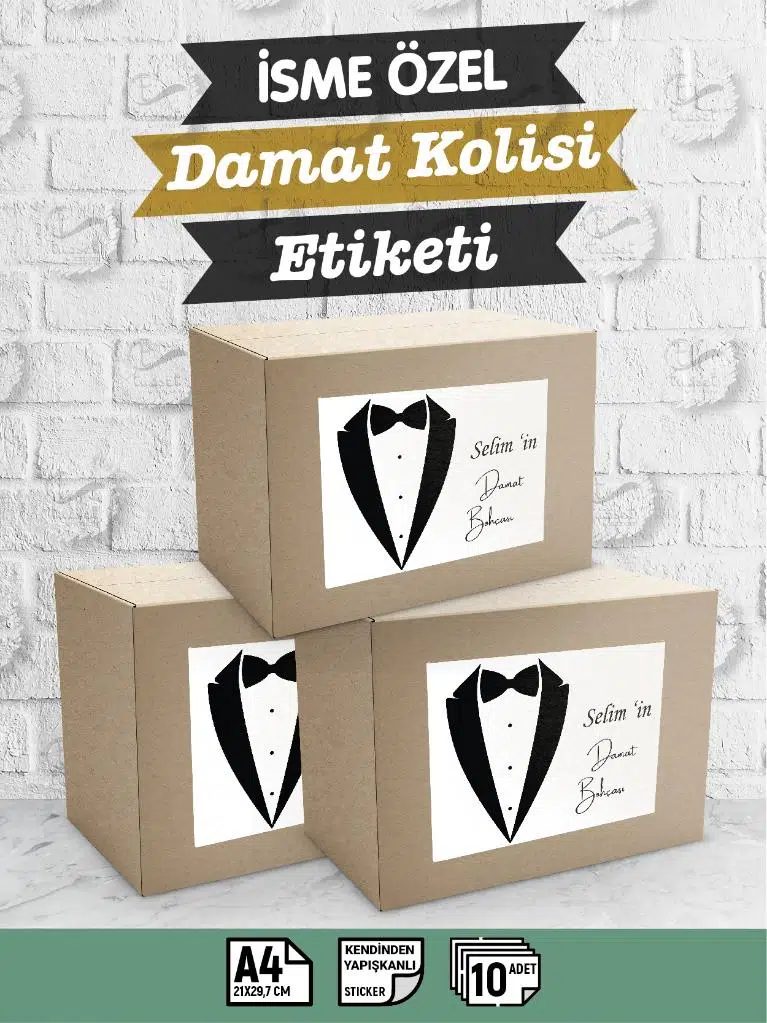 | Etiketler | İsimli Çeyiz Etiketi - A4 Ebat- 10'lu Paket Kendinden Yapışkanlı Çeyiz Kolisi Sticker -Damat Bohçası D1 |