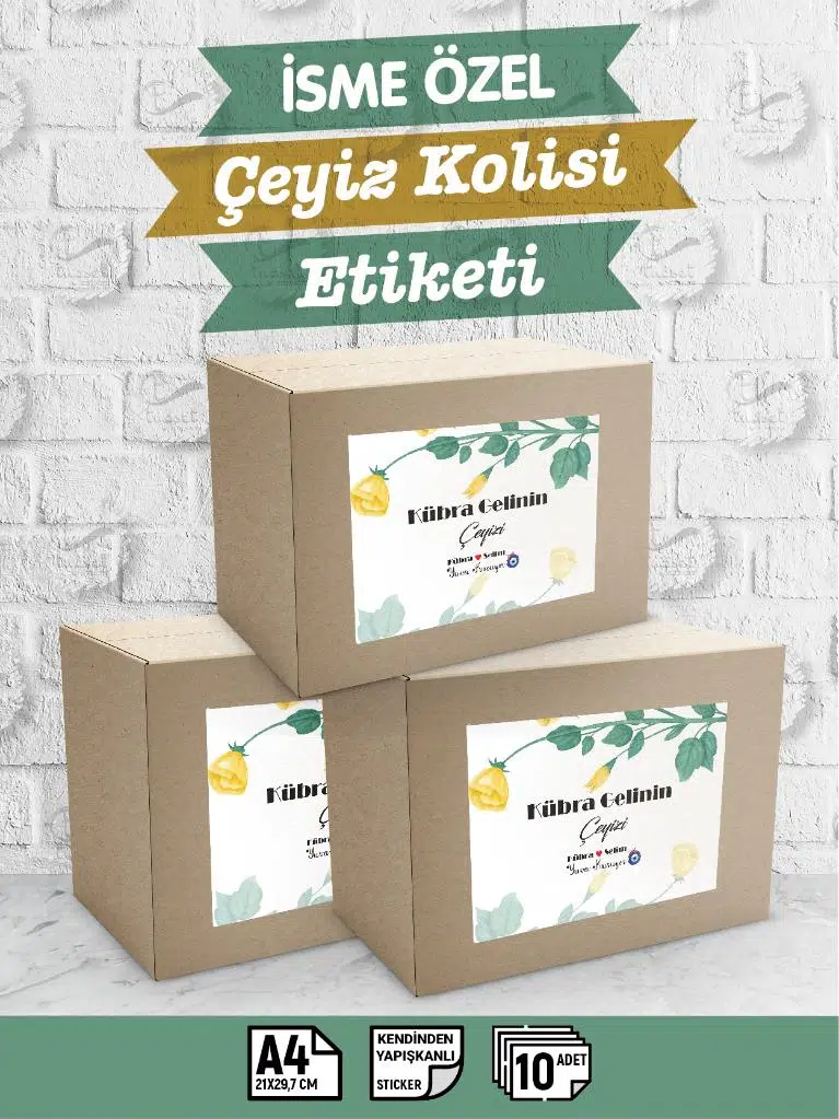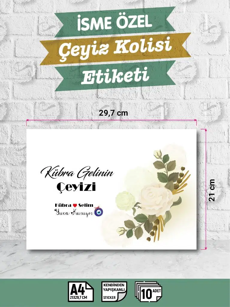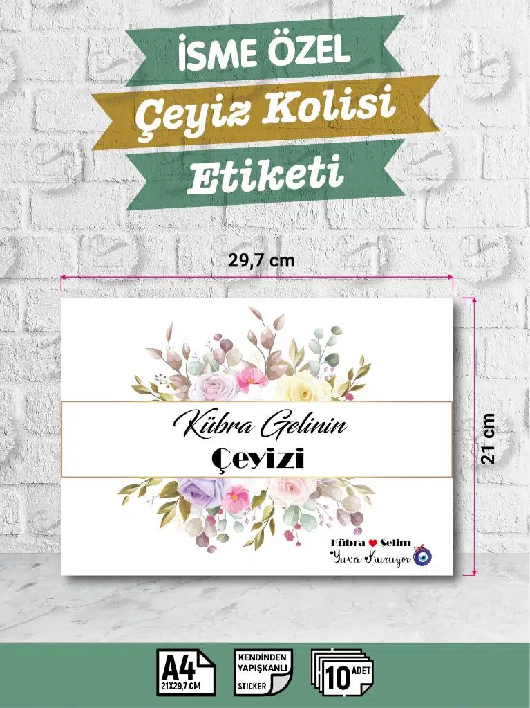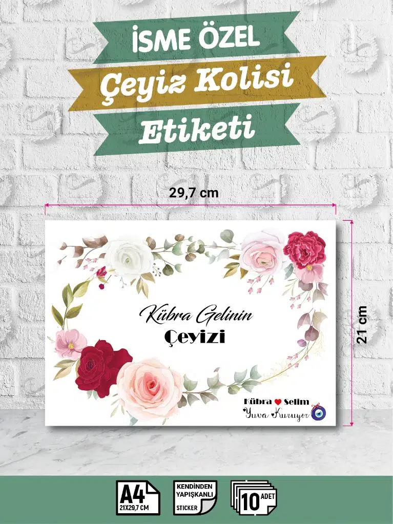 | Etiketler | İsimli Çeyiz Etiketi - A4 Ebat- 10'lu Paket Kendinden Yapışkanlı Çeyiz Kolisi Sticker - Gelin Bohçası |