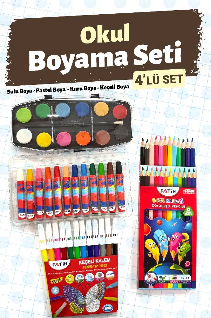 | Etiketler | Okul Boyama Seti 4'lü Set - 12'li Sulu Boya 12'Lİ Kuru Boya 12'li Pastel Boya 12'li Keçeli Kalem |