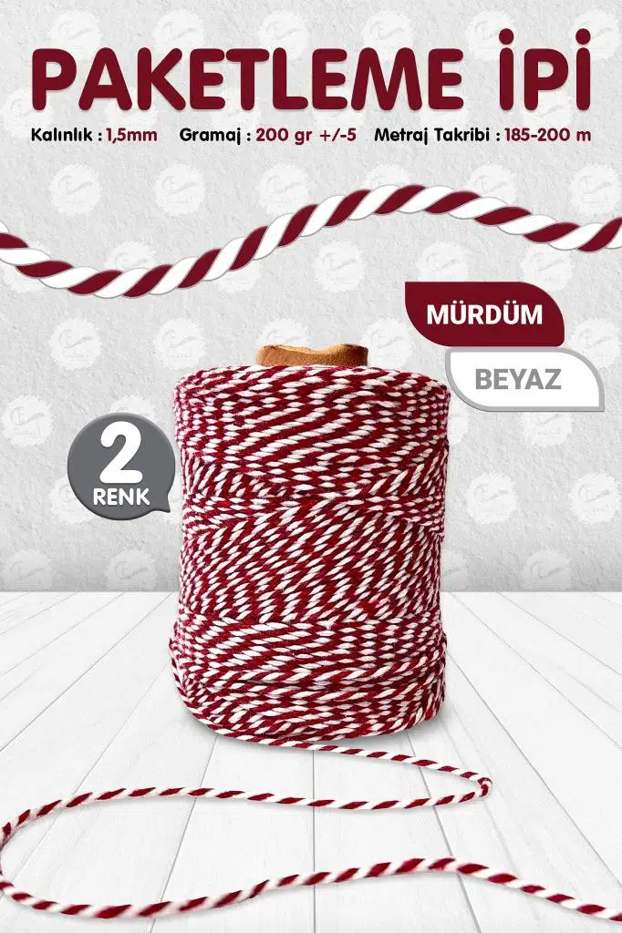 | Etiketler | Paketleme ipi / Bağlama İpi /İki Renkli İp Mürdüm Beyaz Renk 200 mt |