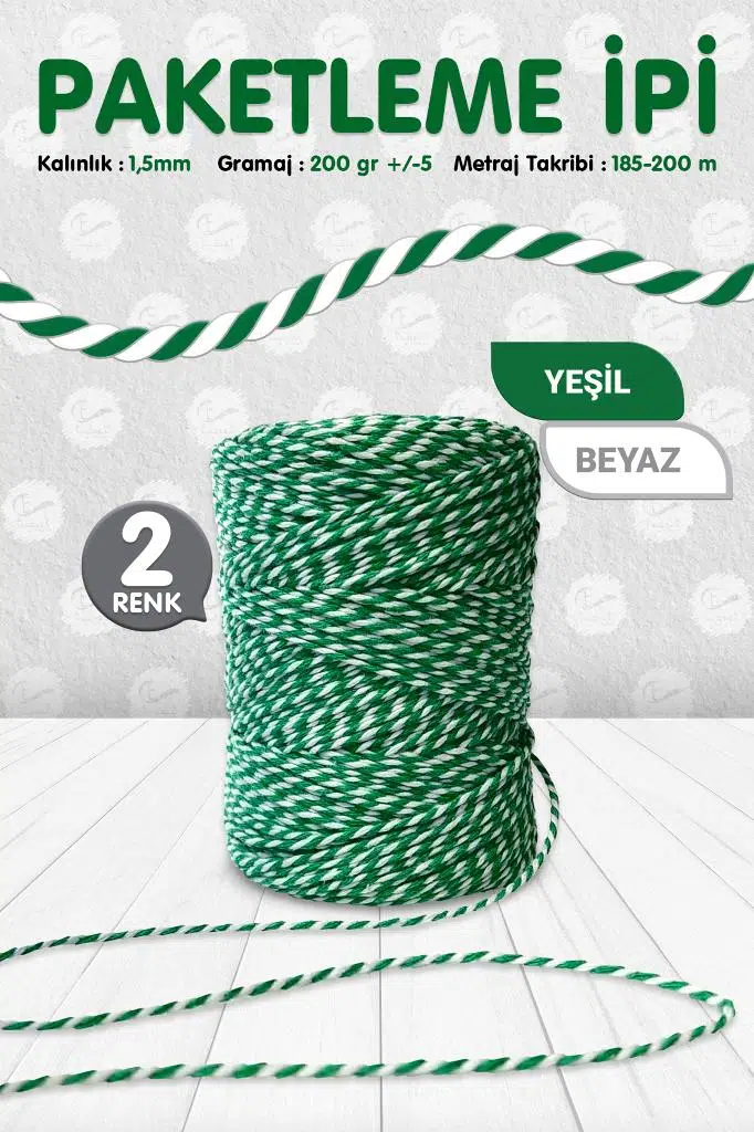 | Etiketler | Paketleme ipi / Bağlama İpi /İki Renkli İp Yeşil Beyaz Renk 200 mt |