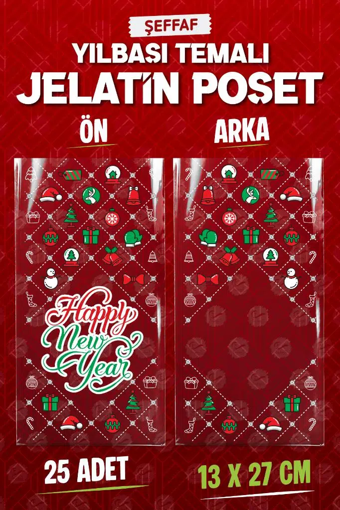 | Etiketler | Yılbaşı Yeni Yıl Temalı Kurabiye Çikolata Şeker Hediye Poşeti 13x27cm 25 Adet Bantsız Şeffaf Poşet Jelatin |